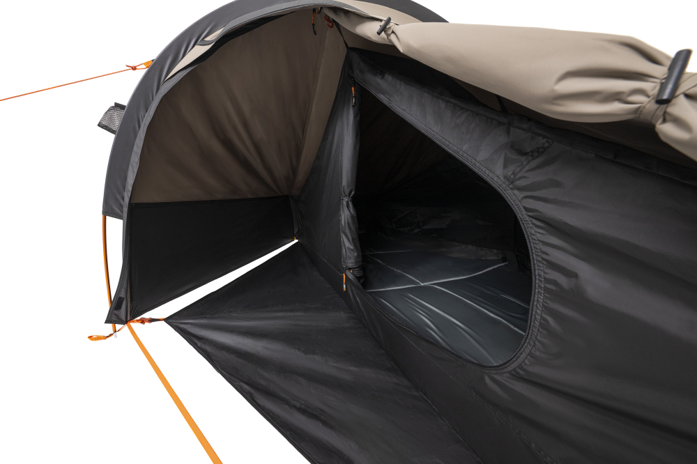 Constructed from Oztent’s durable, light-diffusing CT-Tex™ fabric, it helps reduce light exposure for a better sleep-in. Cross-ventilation windows at the head and foot provide excellent airflow, while the front vestibule offers covered gear storage, complete with a floor extension and rain-covered zipper opening to keep your gear dry and protected.