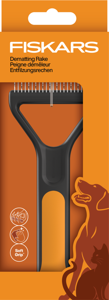 The Fiskars Dematting Rake gently removes mats and loose fur with wider-spaced, curved teeth and a comfortable handle.