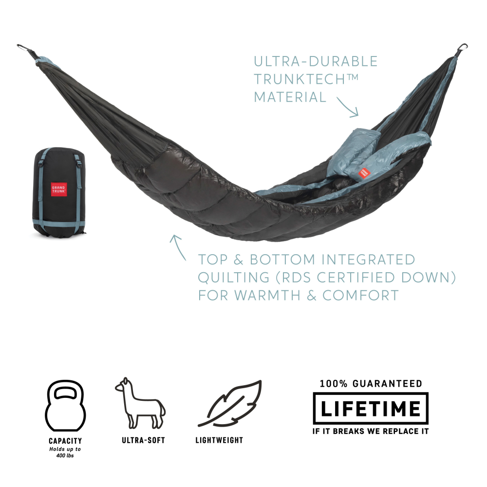 Integrated sleeping bag technology provides the perfect combination of relaxation and warmth. Don't worry about a sleeping bag bunching up, or dealing with an under/over quilt. This innovative product gives you range of motion while staying cozy in a blanket of comfort.