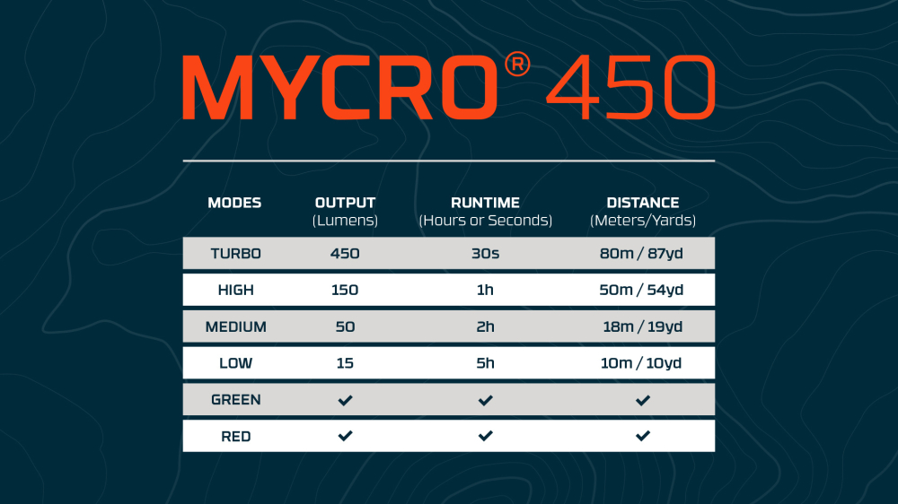 The MYCRO 450 quickly converts from headlamp to cap-light and defies the dark with 6 modes, including the 450-lumen turbo mode and night vision-preserving green and red modes. The PowerSave lockout prevents accidental activation and the integrated tilt allows you to position the beam exactly where you need it.