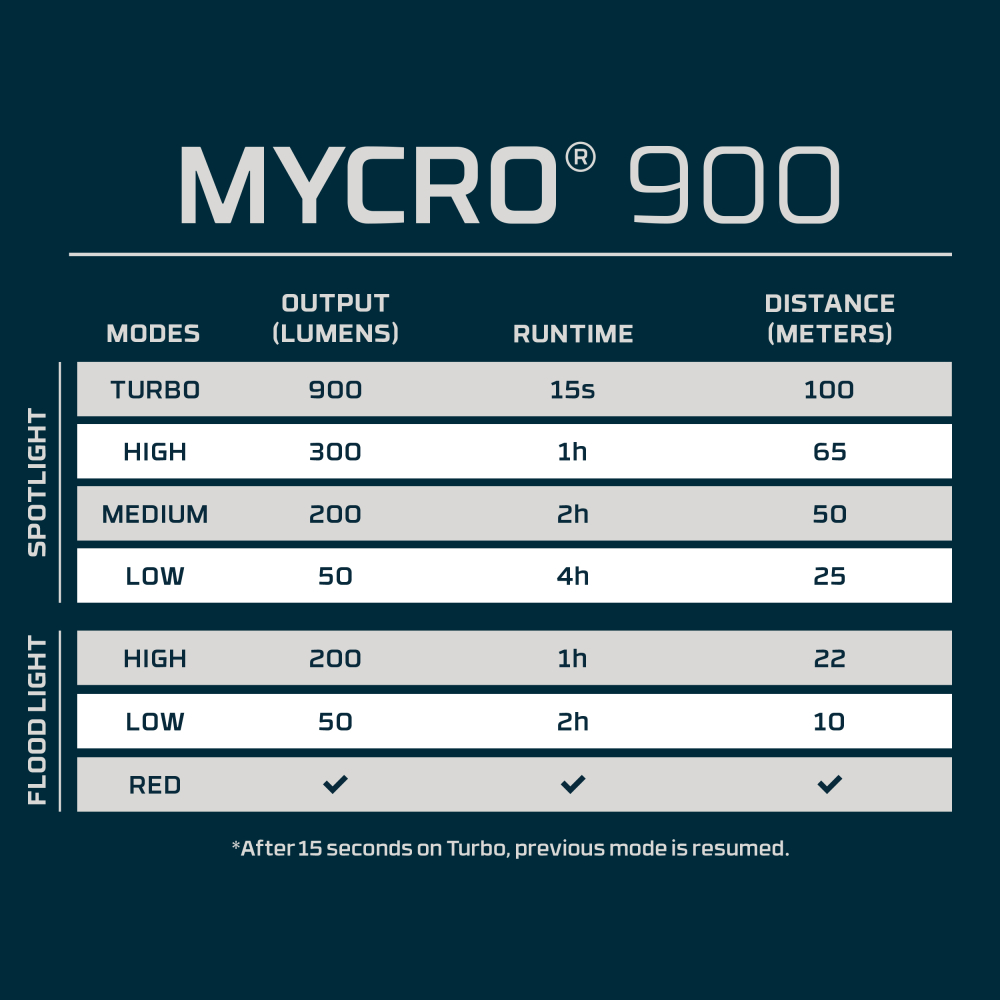· Turbo - Spot + COB (900 Lumens / 100 Meters)