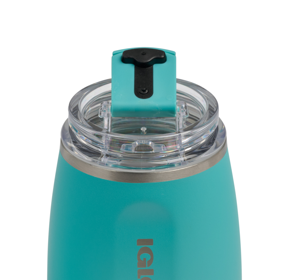 · Flat surface no-look-sip indicator “thumb-grabber” along the side aligns with the mouth opening on the lid