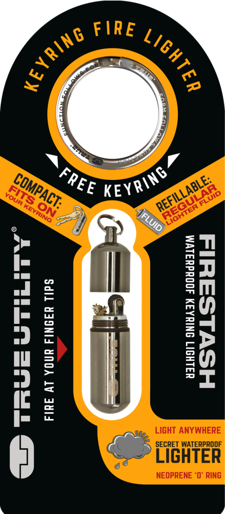 The FireStash is revolutionary in lighting fires, encased in in a waterproof canister, no fire is too big for this pocket-sized lighter. The stylish and safe design makes it the ideal companion for campers and explorers. Simply attach it to your key ring for your convenience. With a dark chrome plated zinc alloy body, the FireStash is compact, yet tough and solid. A neoprene O ring secures the lighter from any water, meaning you have a working lighter even in the pouring rain. Refill the lighter like a standard lighter for repeated use. SUPPLIED IN KEYRING BLISTER PACKAGING
