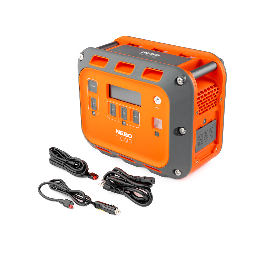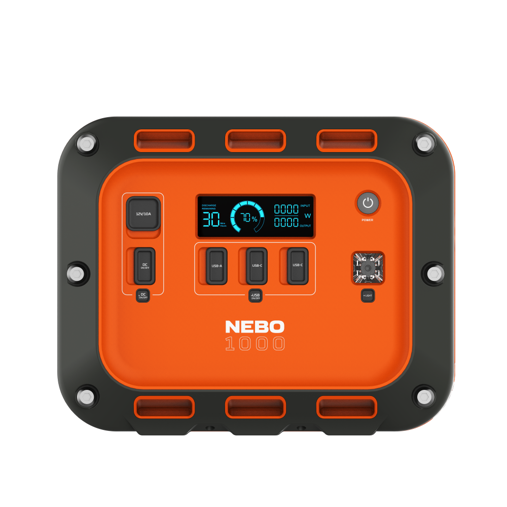 The INTREPID™ 1000 Power Station provides powerful performance for multiple users across multiple days, portability to keep up with your travels, a heavy-duty design, and versatile charging capability. Easily charge the power station at home, in the car or via the sun (solar panel not included) as you prepare to head into the outdoors. Once it’s charged up, you’ll have the confidence and adaptability to power just about and device thanks to the ten-way output via the 2 USB-A ports, 4 USB-C Power Delivery (1 PD 100W, 3 PD 20W) ports, 2 AC ports and 2 DC charging ports. The powerful 1575W AC inverter means that you’ll always have an outlet available so you can work remotely off-grid and with NEBO OVERDRIVE™, you’ll have access to an expanded watt capability to power essential devices during a power outage or higher watt hungry items at the campsite. The Intrepid 1000 was designed with heavy-duty handles to make portability easier and tie-down slots were included at the top and bottom for when you need to keep it secure. Recessed, sturdy port covers protect it from dust or debris and help prolong the lifespan of the unit. The LCD colour display is easy to read, offering real-time input and output data while the integrated floodlight makes it a great emergency tool.