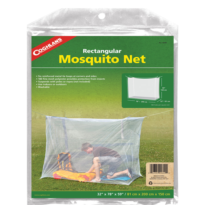 Rectangular shape fits over sleeping bag or cot. 180 Fine mesh polyester provides protection from insects. Suspends with poles or rope (not included) utilizing six reinforced tie tabs at corners and sides. Washable. Use indoors or outdoors. Size: 32� x 78� x 59� (81 x 200 x 150 cm) CASE QUANTITY: 6